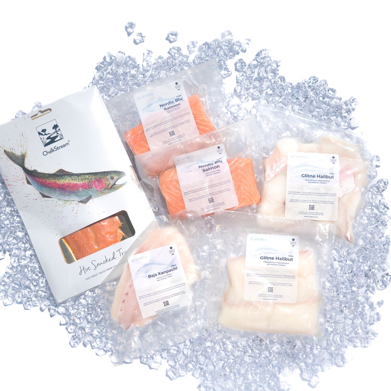 Perfect for a seafood-loving individual seeking the benefits of 3 servings of super clean seafood per week. Start enjoying the benefits of eating clean ocean-friendly seafood with our 12 portion sample box of individually packaged 4 to 6 oz. servings. Incredibly delicious, vital, and empowering seafood, all meticulously sourced directly from the world's leading smart aquaculture projects: