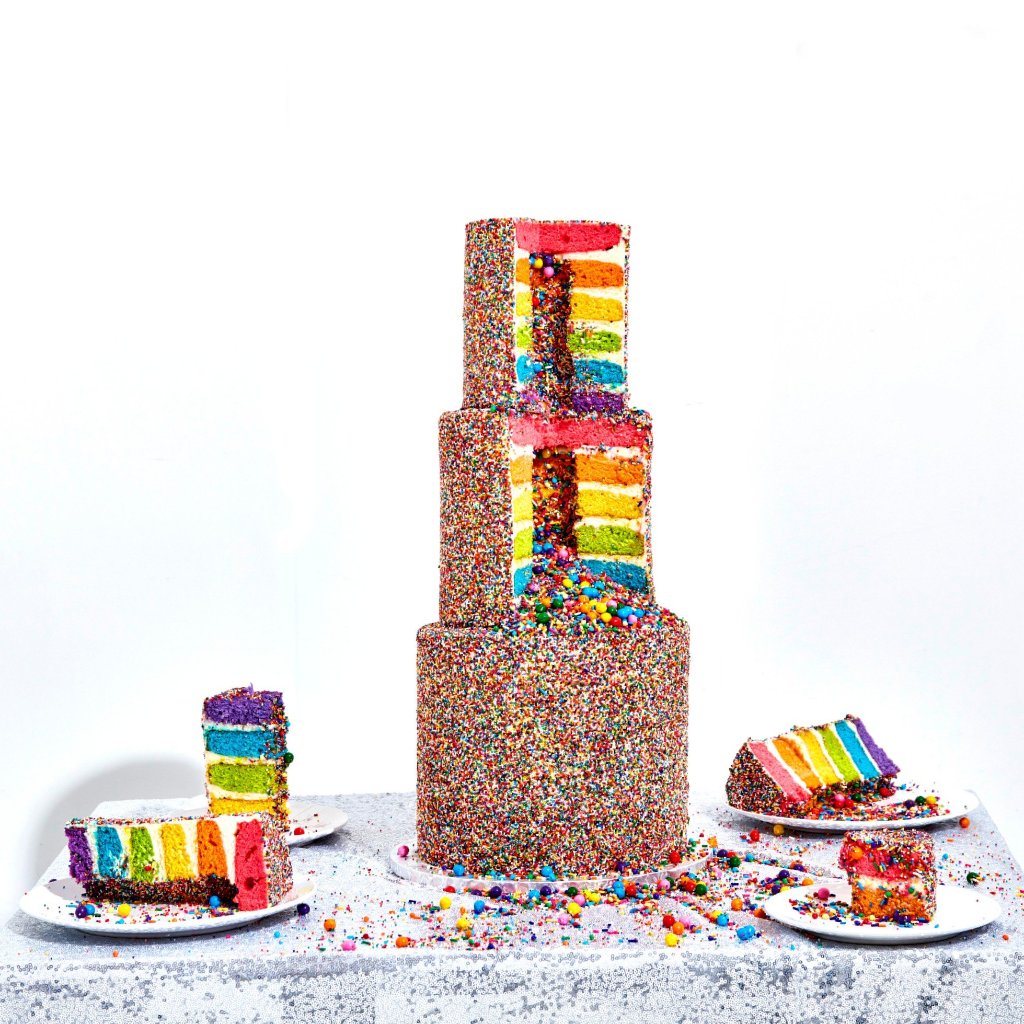 Each tier has 6 layers, cream cheese frosting, decorated with nonpareils and contain a sprinkle surprise in the center.