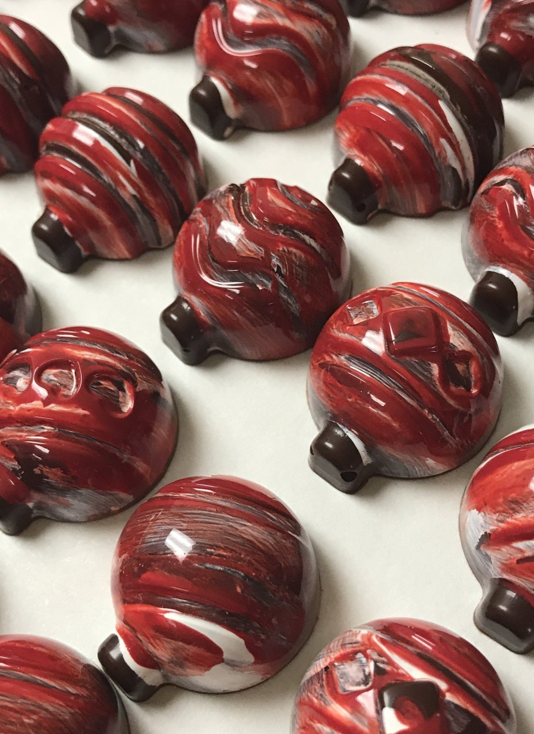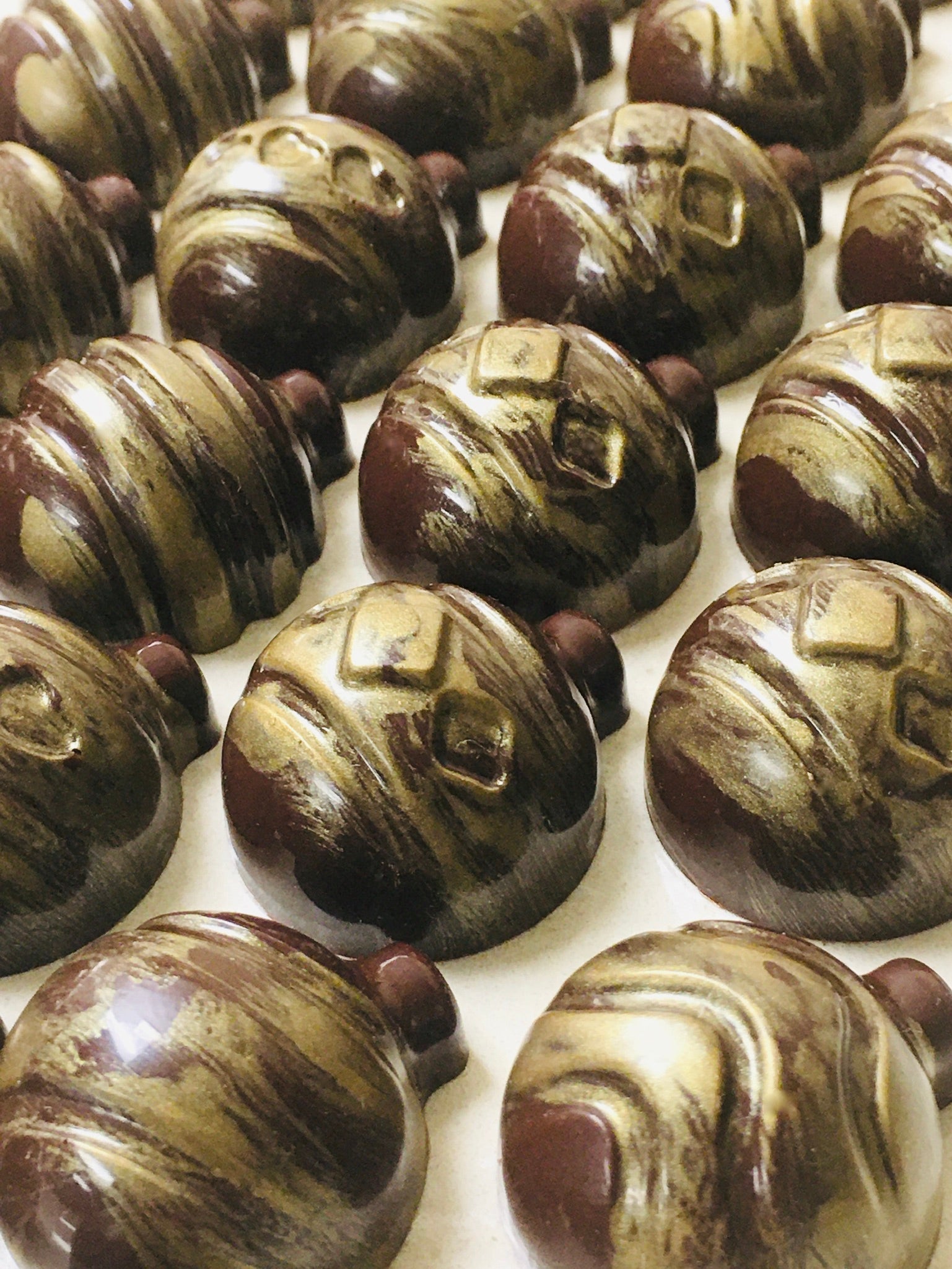 Three very special heavenly gourmet-chocolate petite ornaments are all filled, hand-painted & freshly made. An assortment of Peanut Butter-Caramel, Raspberry, and Almond-Butter Milk Chocolate. Sure to delight adults and children alike!