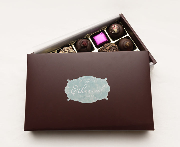 Caramello Yellow - gooey coconut milk caramel in a dark chocolate shell Passion - dark chocolate ganache with caramel and passionfruit Salted Karma - dark chocolate ganache with caramel and sea salt Tahitian Vanilla Caramel - dark chocolate ganache with caramel and Tahitian vanilla