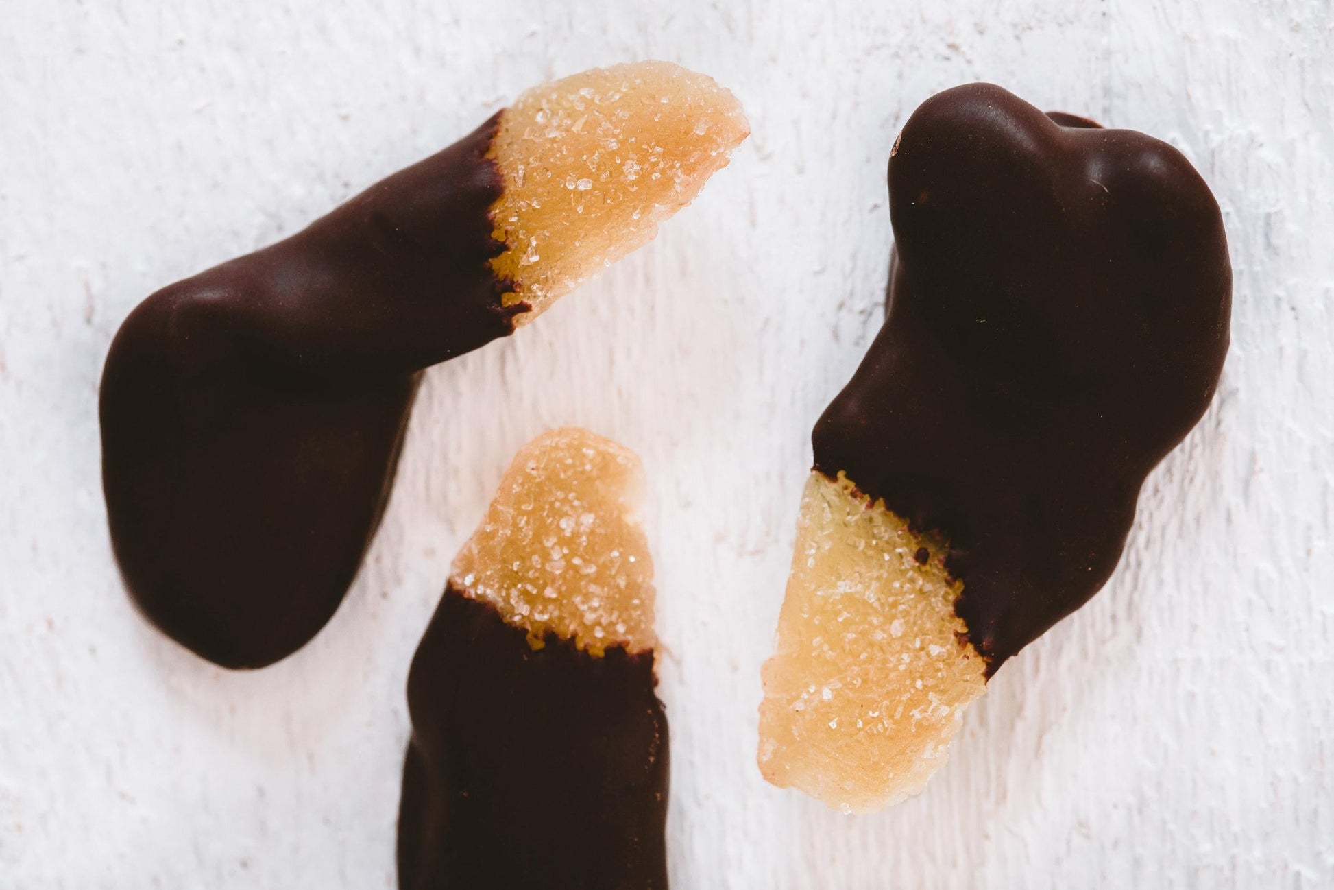 Organic ginger slices are candied then dipped in our organic 66% dark chocolate.