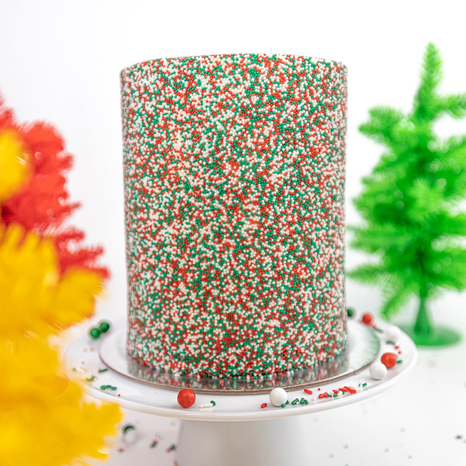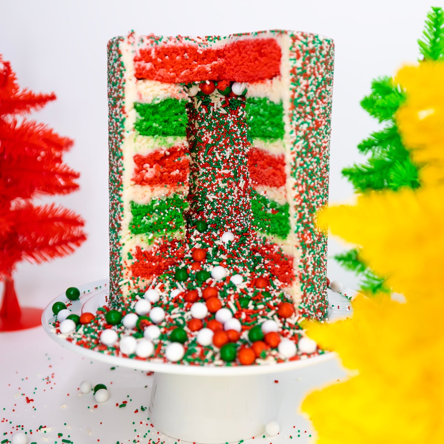 This holiday explosion® cake has 6 vanilla layers, cream cheese frosting, is decorated with red, green and white nonpareils and contain a sprinkle surprise in the center. Comes in a Flour Shop Cake Box.