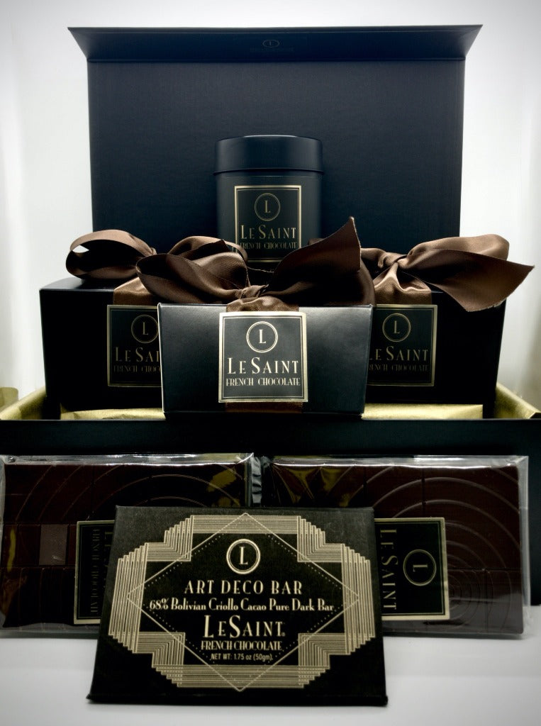 For those who like it dark, we offer a box of blissful dark chocolate favorites to please the most discerning palette. Contains 9oz Pure Dark Hot Chocolate, 9oz Extra Dark Truffles, 9oz Arancia Orange Dark Truffles, 4.5oz Moroccan Mint Pavés and 3 Art Deco Bolivian Bars and is over 2 lbs of chocolate. An impressive hostess or business gift and a luxurious gourmet chocolate indulgence!
