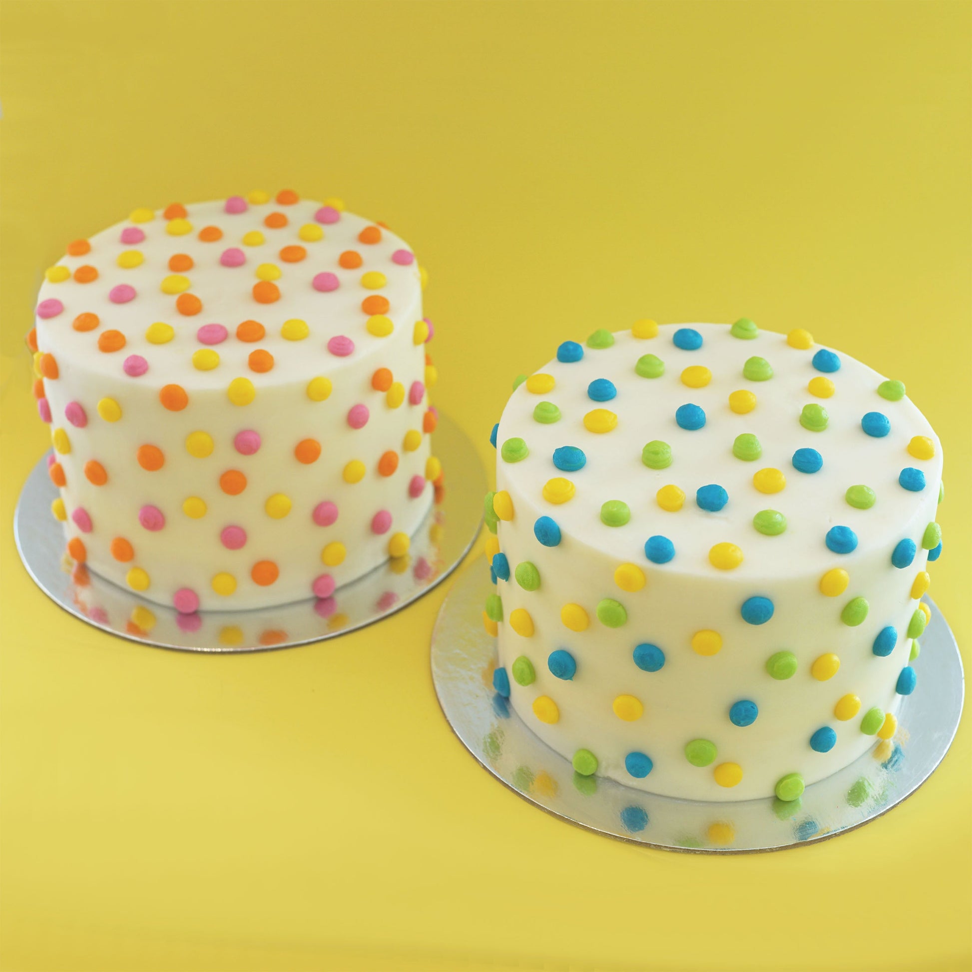 Cake layers consist of vanilla cake, cream cheese frosting, decorated with corresponding dots.
