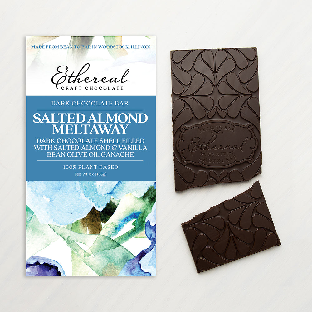 Handcrafted dark chocolate filled with a one of a kind sweet, bright and creamy french vanilla & salted almond center from naturally infused olive oil and vinegar