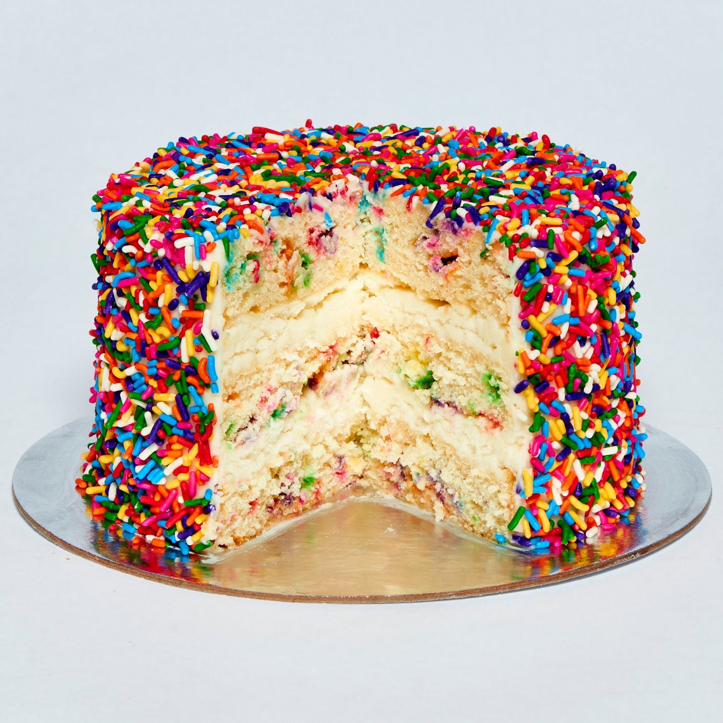 Our Fun Size Funfetti Cake has 3 layers of vanilla funfetti cake, cream cheese frosting, decorated with rainbow gel sprinkles.