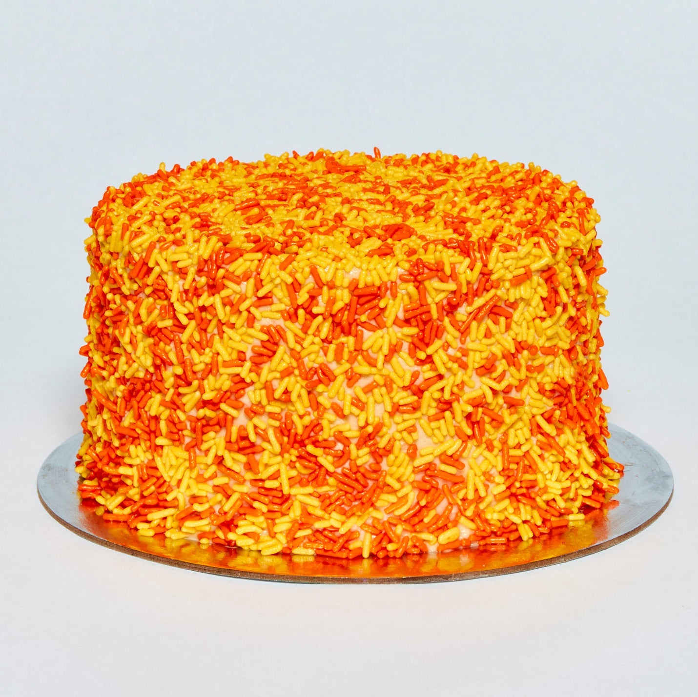 Our Fun Sized Peanut ButterCake is 3 layers of chocolate cake, peanut butter cream cheese frosting, decorated with yellow and orange gel sprinkles.