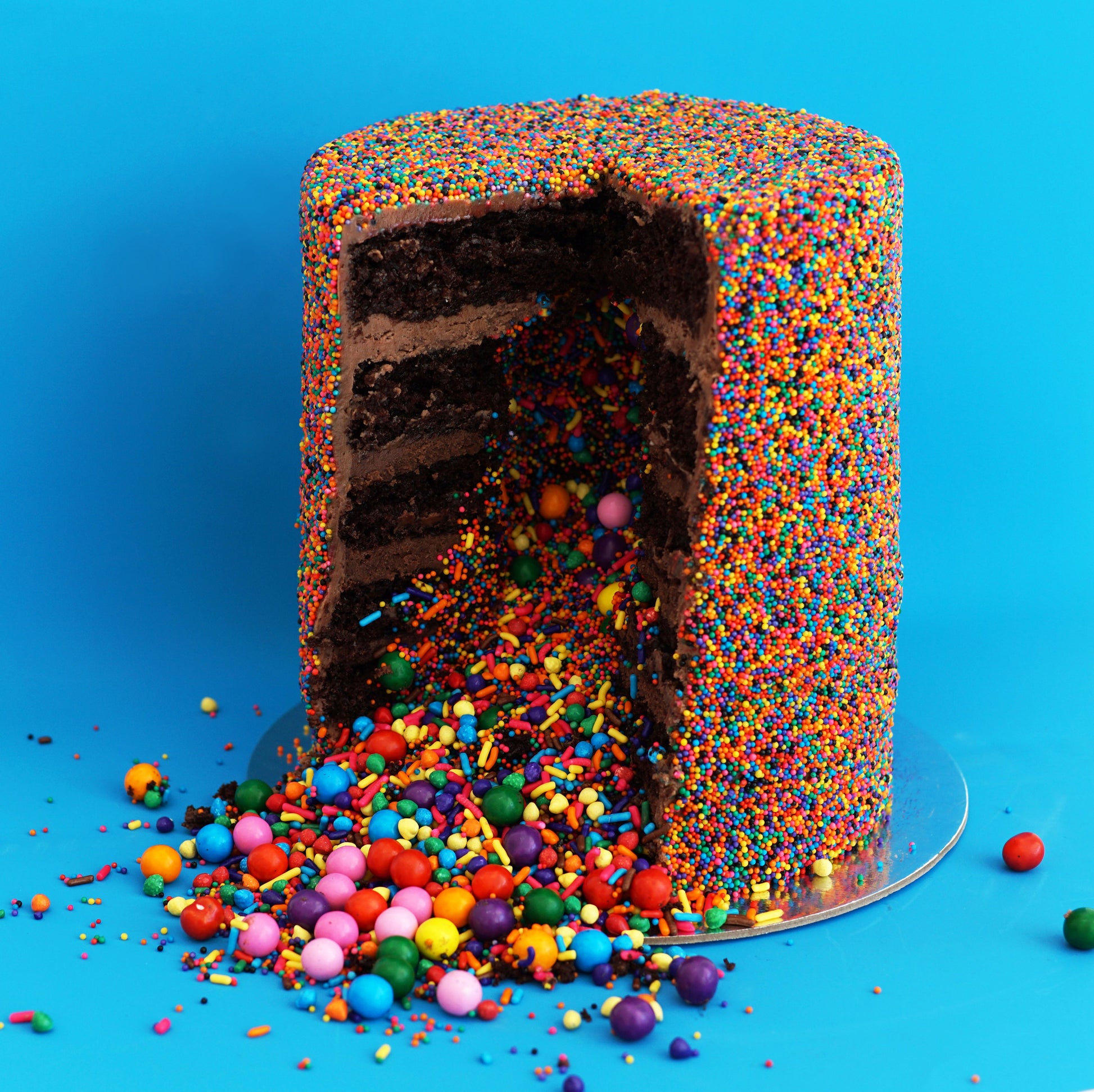 Our Midi Chocolate Cake is 6 layers of chocolate cake, chocolate cream cheese frosting, decorated with rainbow nonpareils and contain a sprinkle surprise in the center. Comes in a Flour Shop Cake Box.
