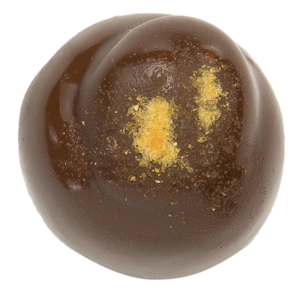 Caramelized sugar and passion fruit dark chocolate ganache, finished with passion fruit powder