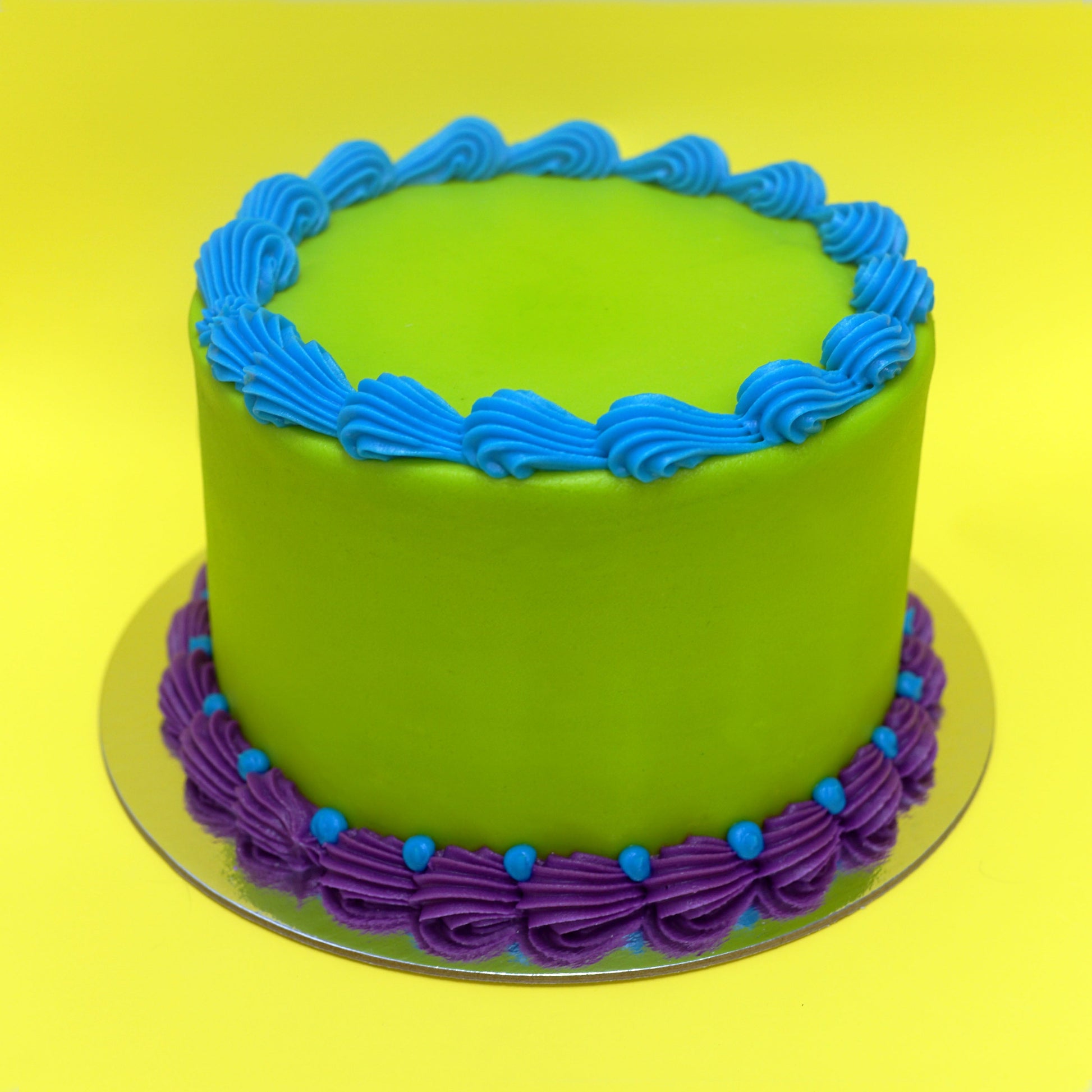 - Yellow- All frosting in yellow; top piping in Green; bottom piping in Blue; dots on bottom in Green