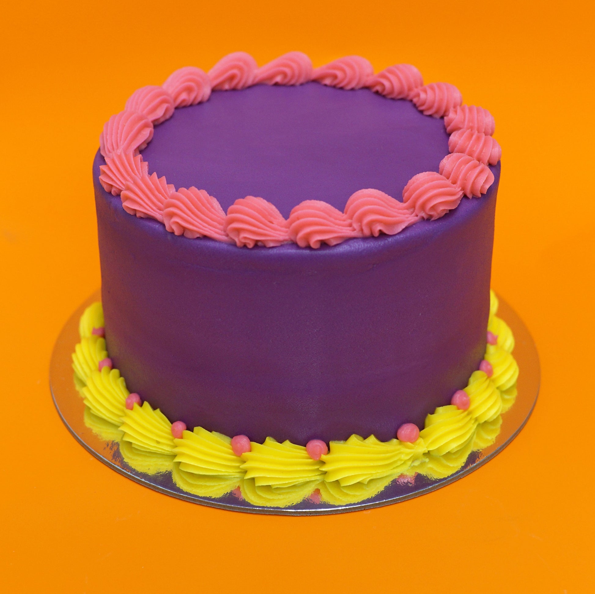 - Purple- All frosting in Purple; top piping in Pink; bottom piping in Yellow; dots on bottom in Pink