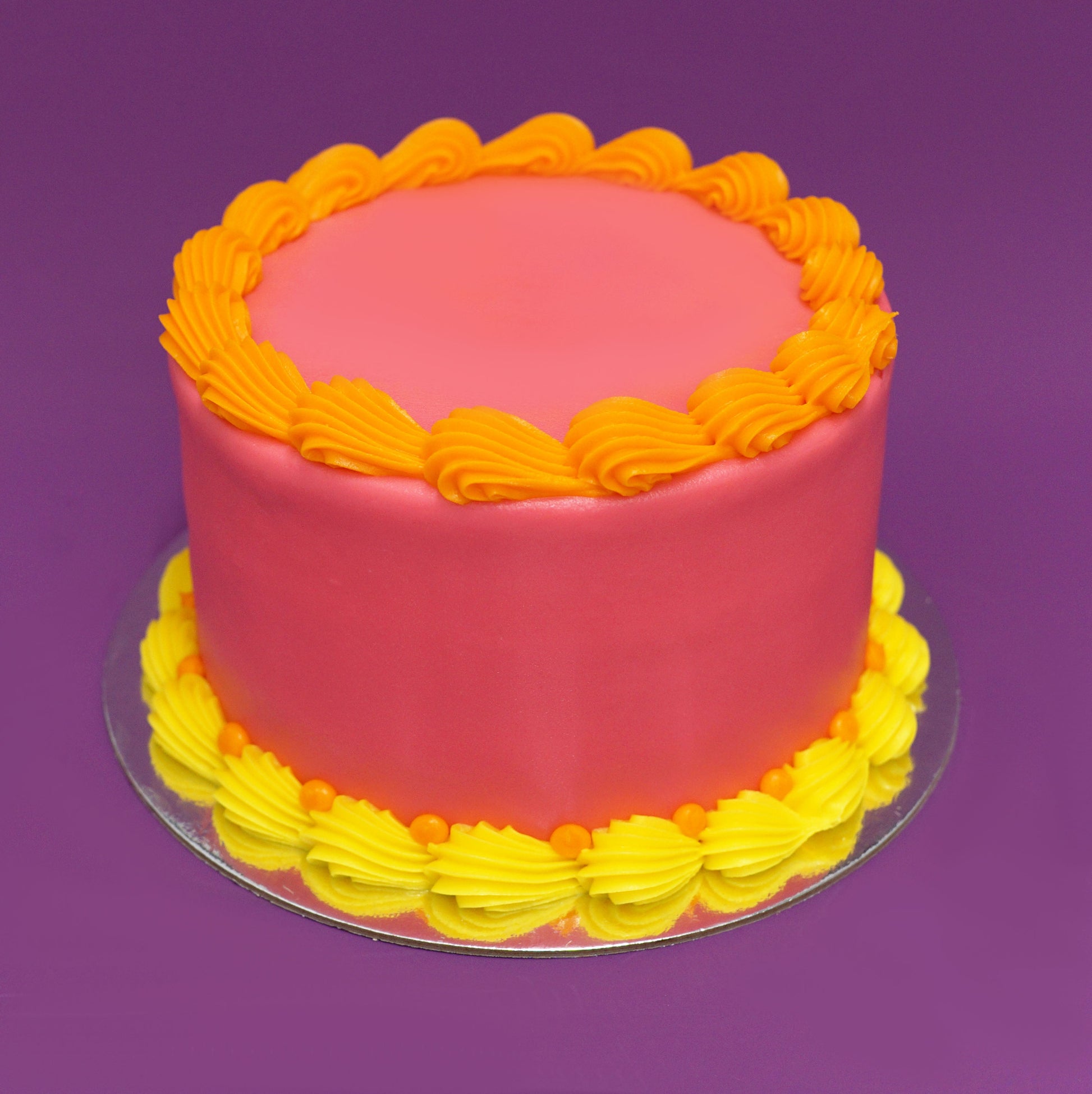- Pink- All frosting in pink; top piping in Orange; bottom piping in Yellow; dots on bottom in Orange