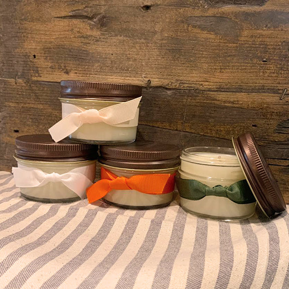 4oz adorable glass jar candles with a rustic lid. 100% soy wax for a long lasting great scent with a slow burn. Perfect gift idea!