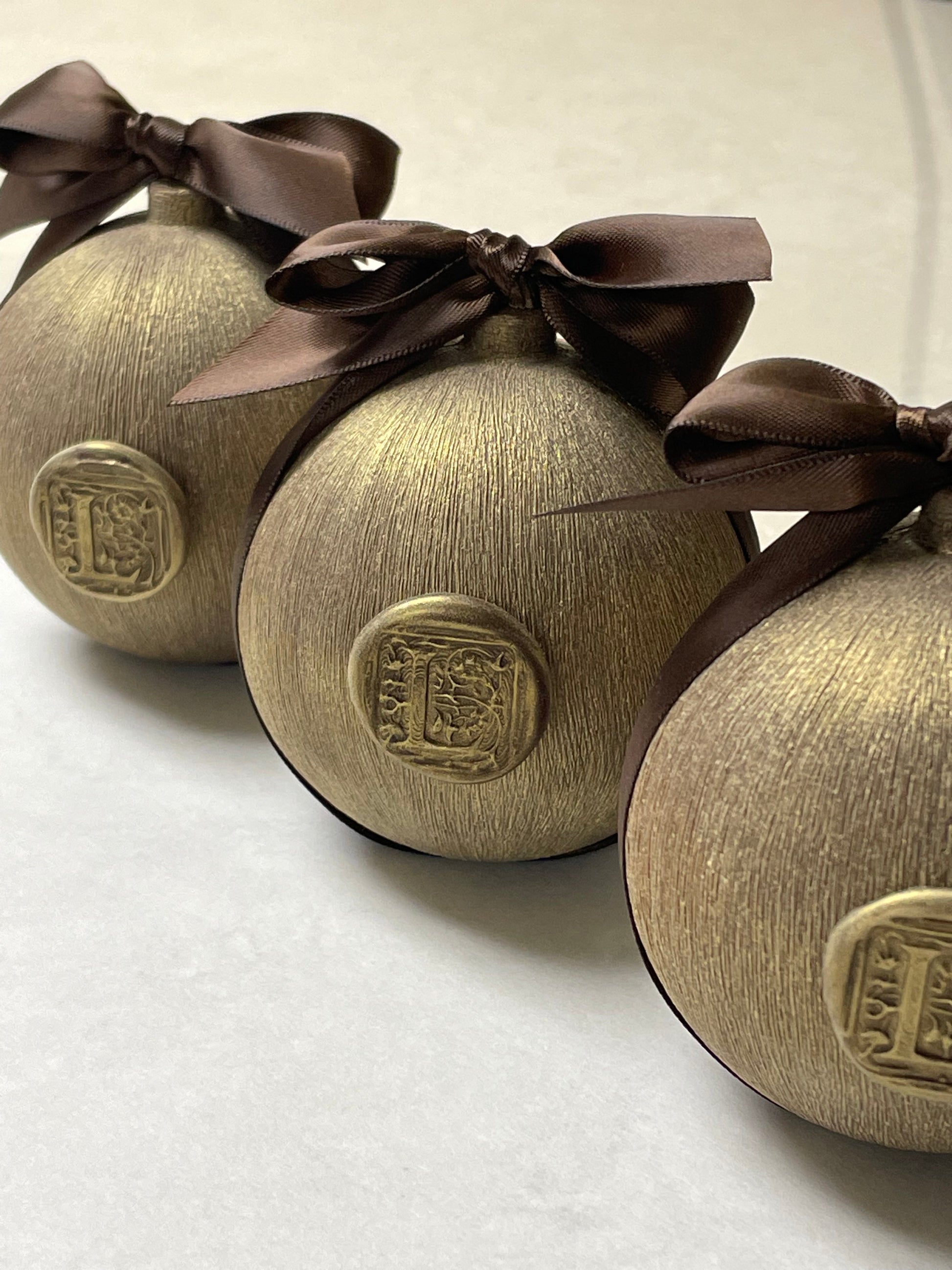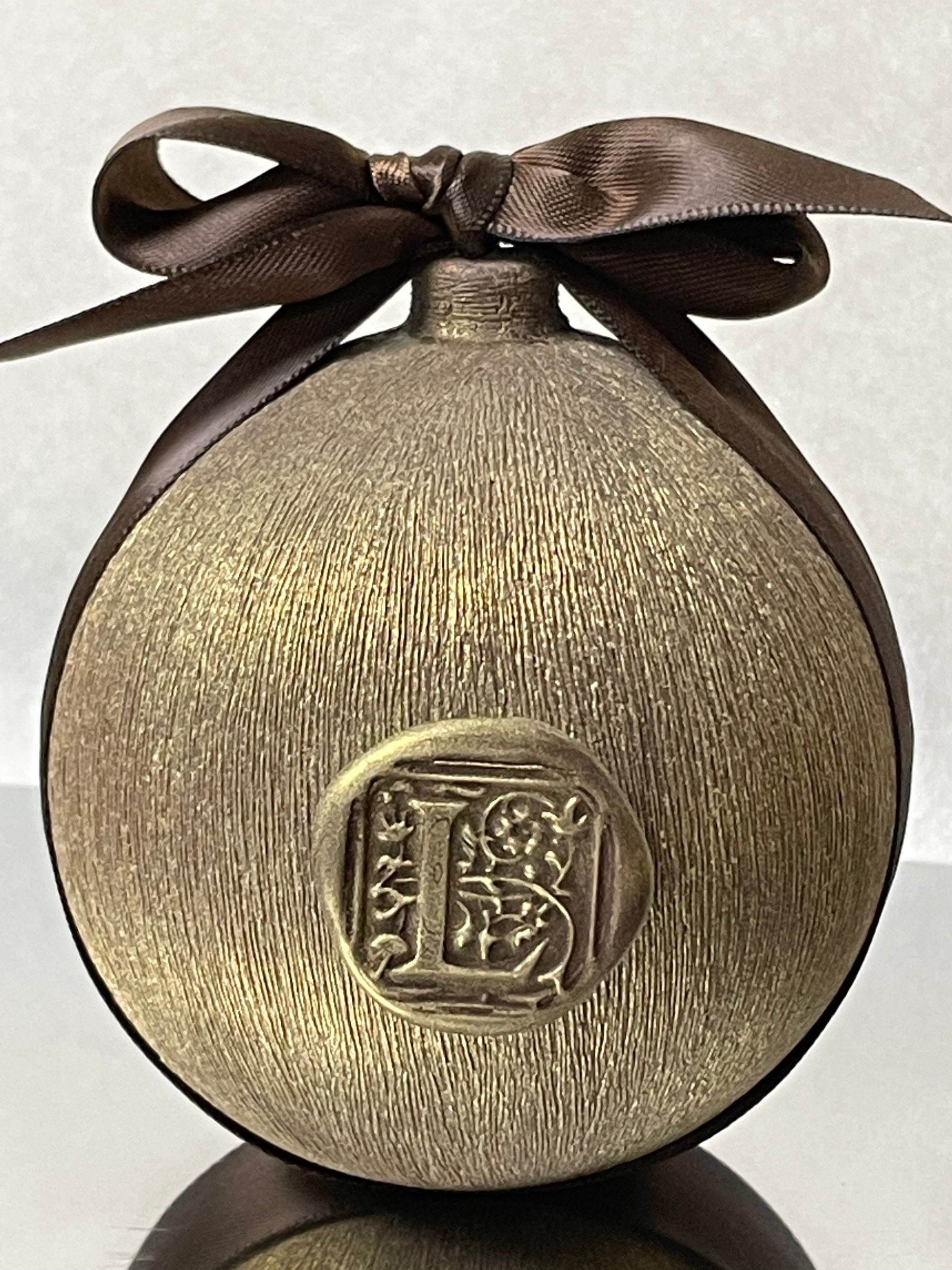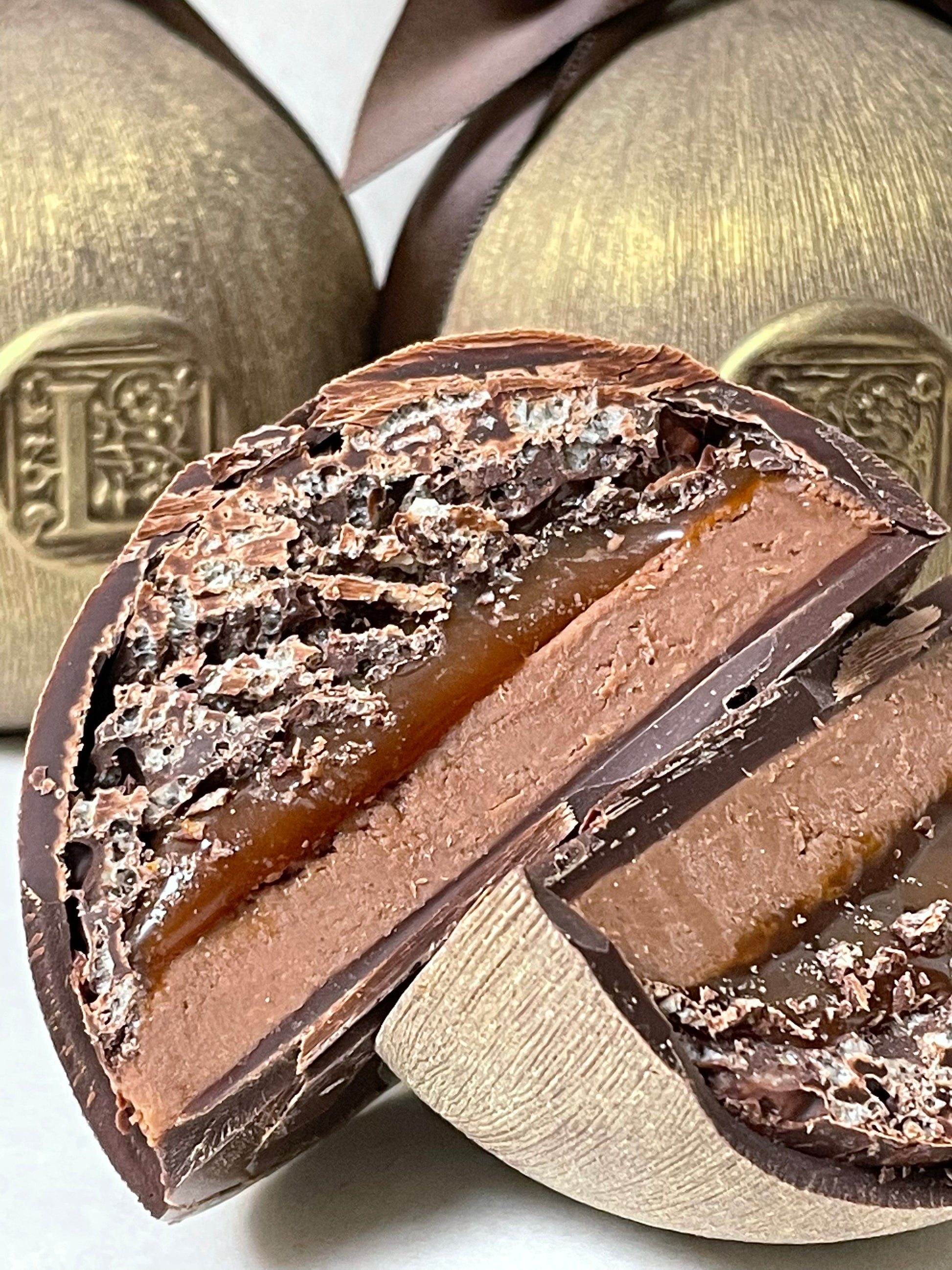 This solid chocolate ornament is 3-½" round and weighs about 1/2 lb. Enrobed in dark chocolate couverture and hand-painted with edible golden cocoa butter, it's filled with 3 layers of decadence: CRISPY RICE MILK CHOCOLATE, FRESH CARAMEL, and NUT BUTTER. Choice of ALMOND-BUTTER MILK CHOCOLATE or PEANUT-BUTTER MILK CHOCOLATE. Our signature 'L' stamp finishes it with style!