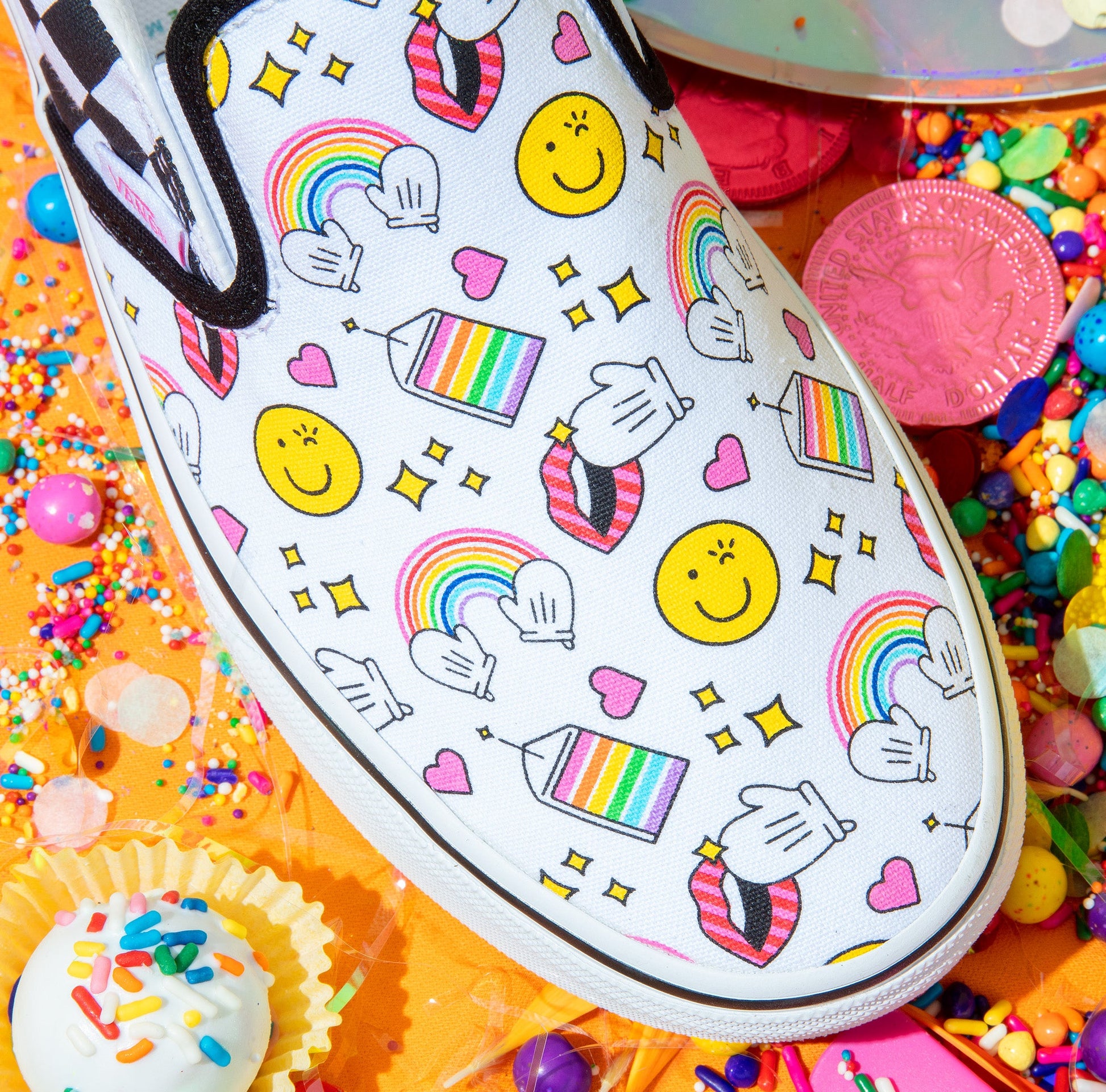 We've launched an amazing creative and colorful new collaboration with Vans! The Vans x FLOUR SHOP Classic Slip-On combines the iconic Vans slip-on style with checkerboard and rainbow cake prints.