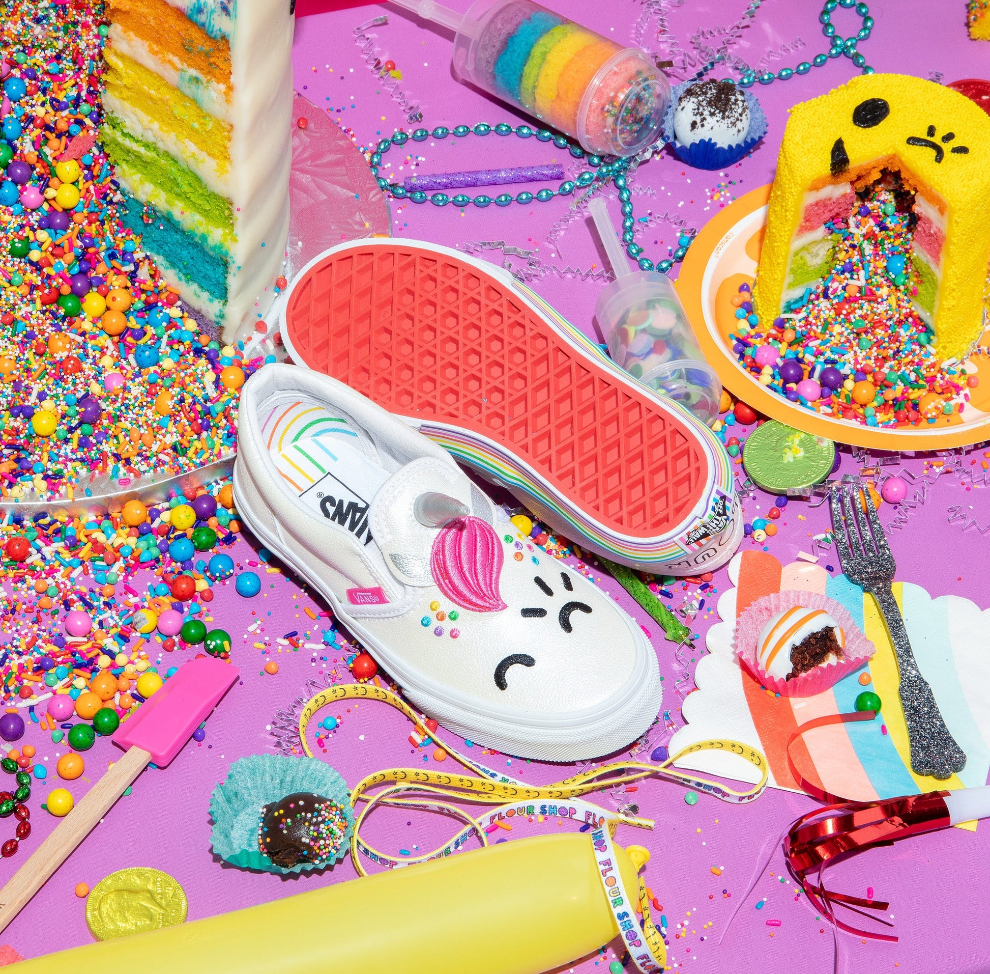 We've launched an amazing creative and colorful new collaboration with Vans! The Vans x FLOUR SHOP Kids Classic Slip-On combines the iconic Vans slip-on style with unicorn styling and rainbow accents.