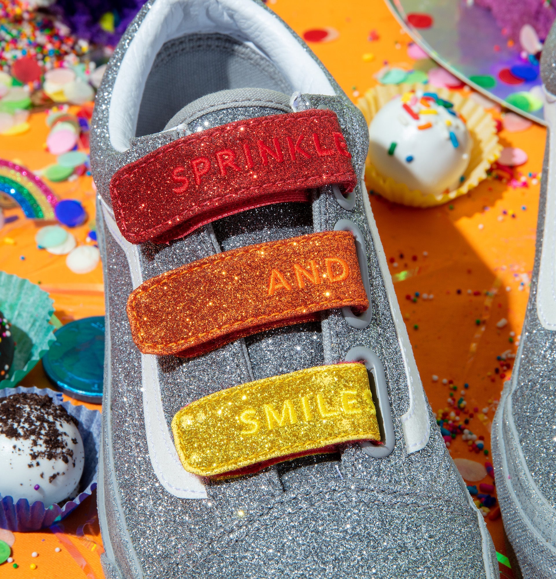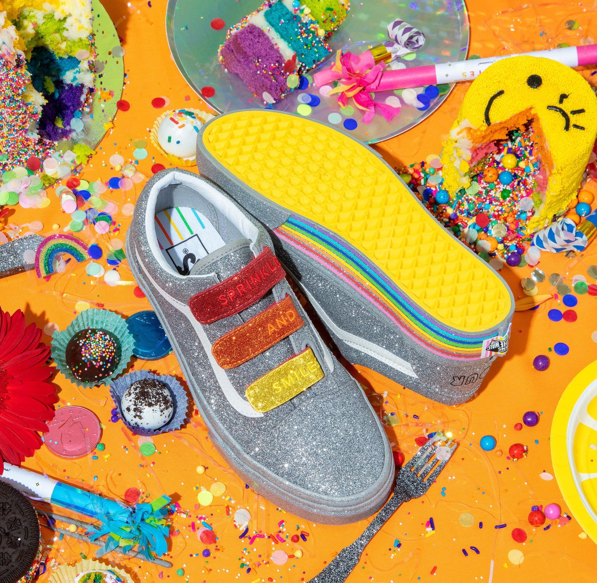 We've launched an amazing creative and colorful new collaboration with Vans! Part of a creative and colorful new collaboration, the Vans x FLOUR SHOP Old Skool V combines the iconic Vans sidestripe skate shoe with triple hook-and-loop closures, allover glitter, and rainbow accents.