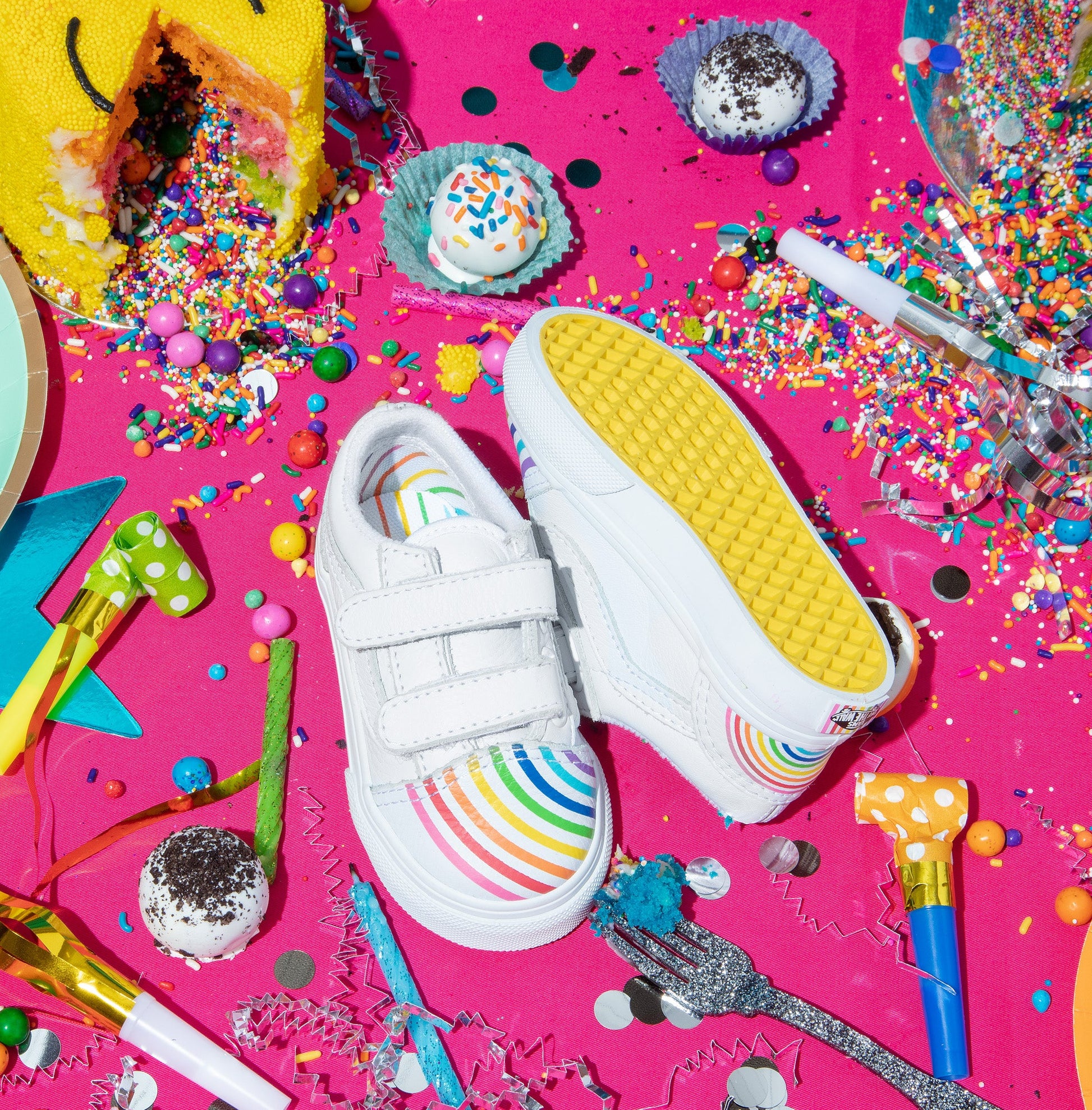 We've launched an amazing creative and colorful new collaboration with Vans! Part of a creative and colorful new collaboration, the Vans x FLOUR SHOP Toddler Old Skool V combines the iconic Vans sidestripe skate shoe with double hook-and-loop closures, and rainbow prints at the toe and heel.