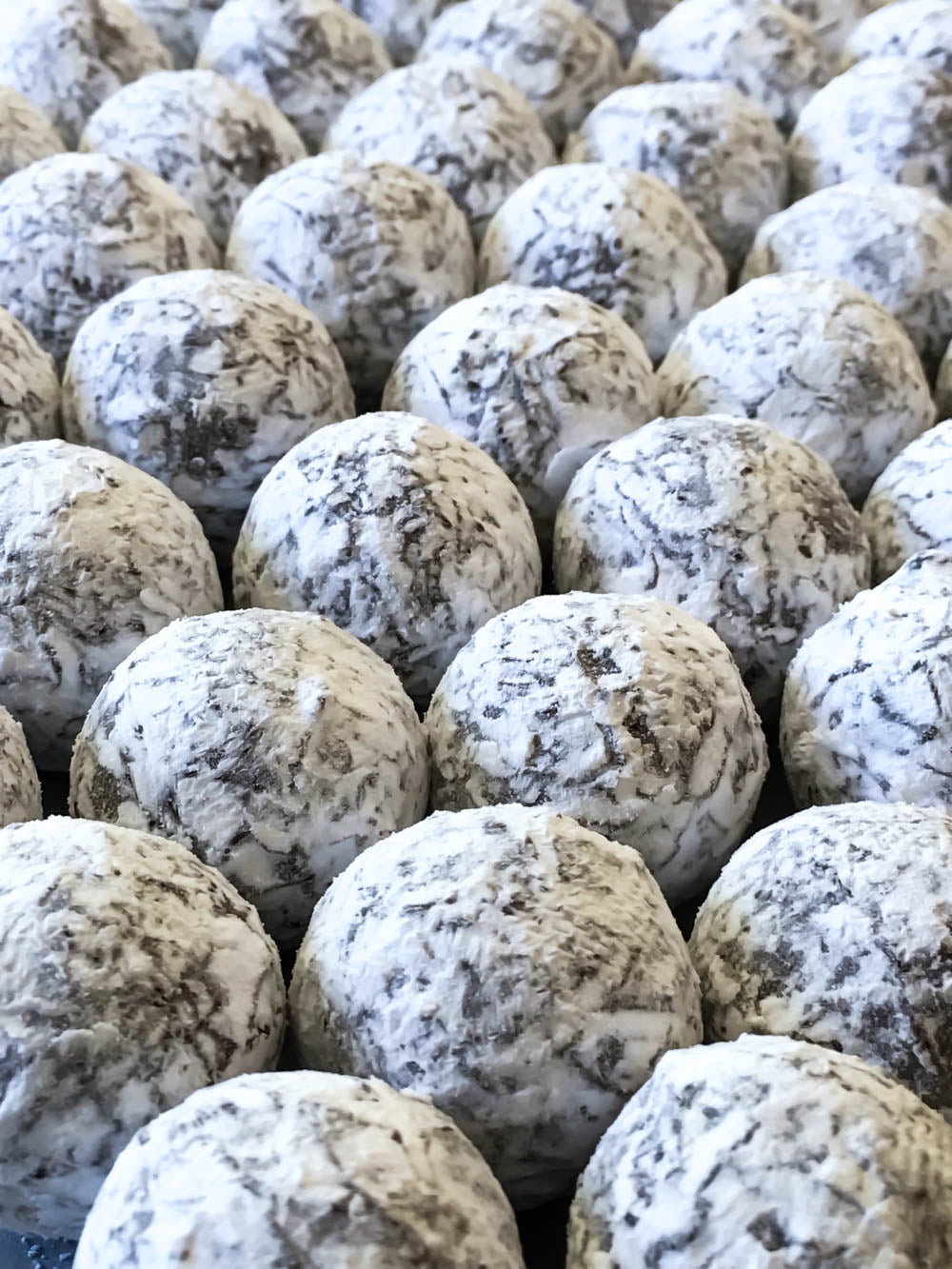 Our boozy truffles: 68% Bolivian wild single-origin cacao is used in our gourmet dark chocolate ganache with a nip of whiskey, Bourbon to be specific. These tasty delights are then rolled in pale-green powdered sugar. Down the hatch!